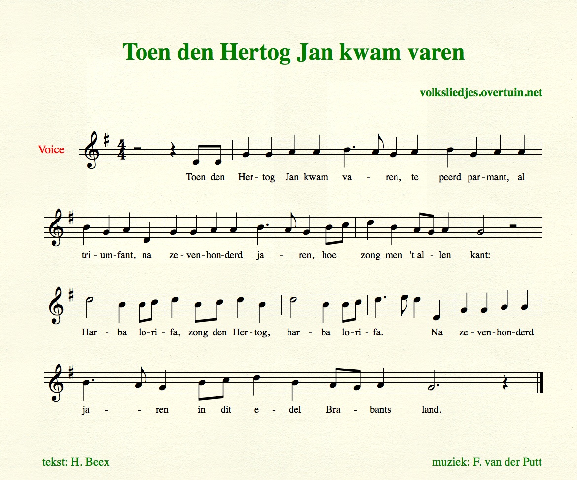 Uitleg: Hertog Jan: Jan I, hertog van Brabant (1253-1294). Deze hertog schreef verschillende liederen, waaronder 'Eins meien morgens fruo was ich uf gestan' met als refrein 'Harba harba lori fa, harba lori fa'.